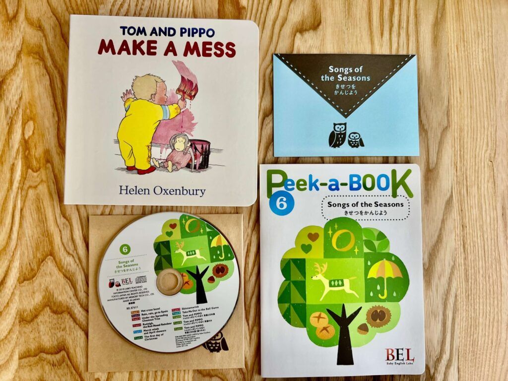 内容はいつもと同じで、絵本とCD、遊び方のガイドブック、オレンジ色のカードは親向けのメッセージカードです。
