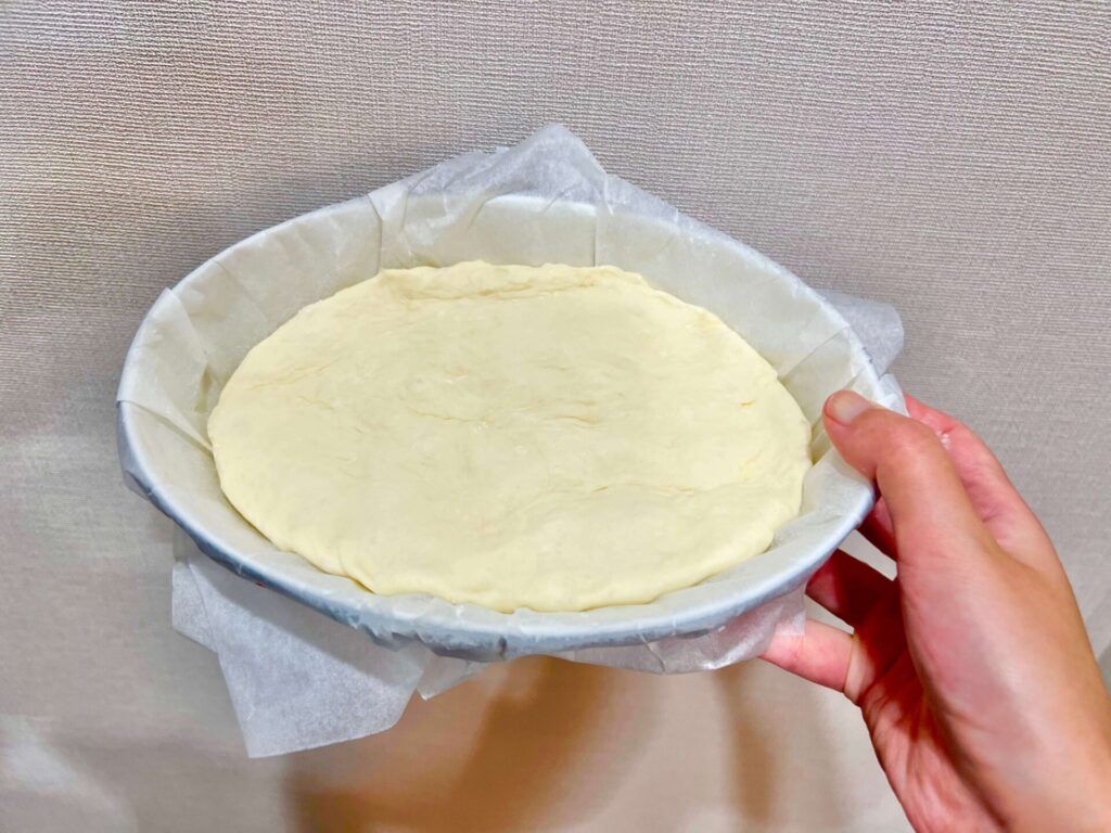 ③【成形】オーブンシートを敷いた皿に生地をのせ、伸ばす。