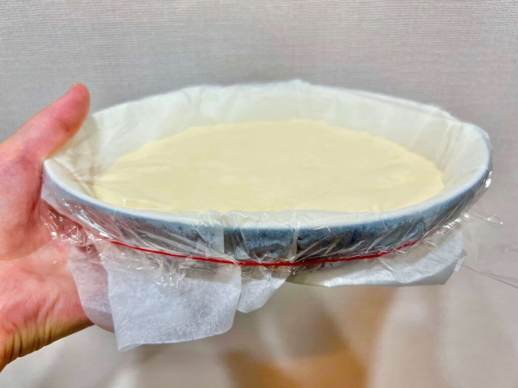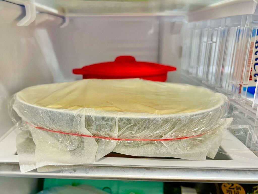 ④【発酵】ラップをして、隙間が開かないように輪ゴムで止めて冷蔵後に入れる。