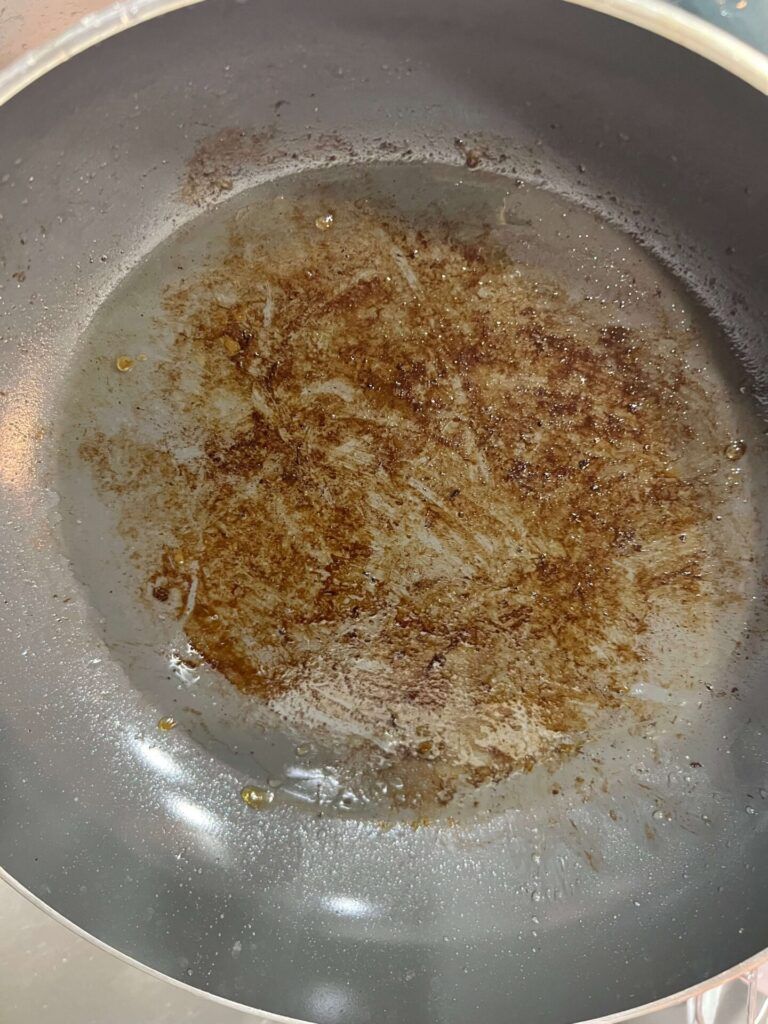 本当に熱々のうちに水につけなくて大丈夫?と心配になると思いますが、こちらお肉を焼いてから放置した焦げ付いたフライパンです⬇︎
