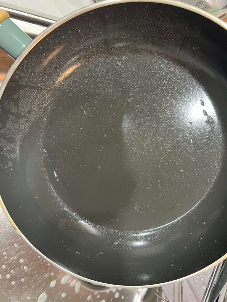 調理前に必ず中火で30秒〜1分予熱し、温まったら少量の油を引きます。