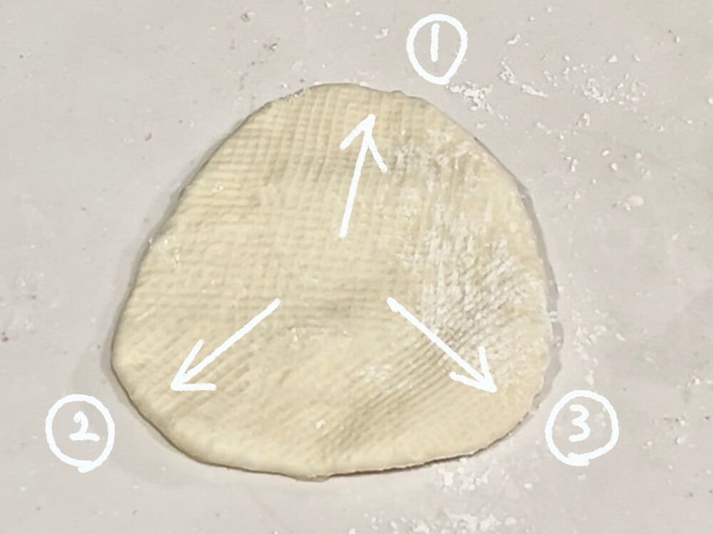 ③ベタつく場合は打ち粉(強力粉)をし、丸めた際の綴じ目を上にして置き、めん棒で三角になるように伸ばす。