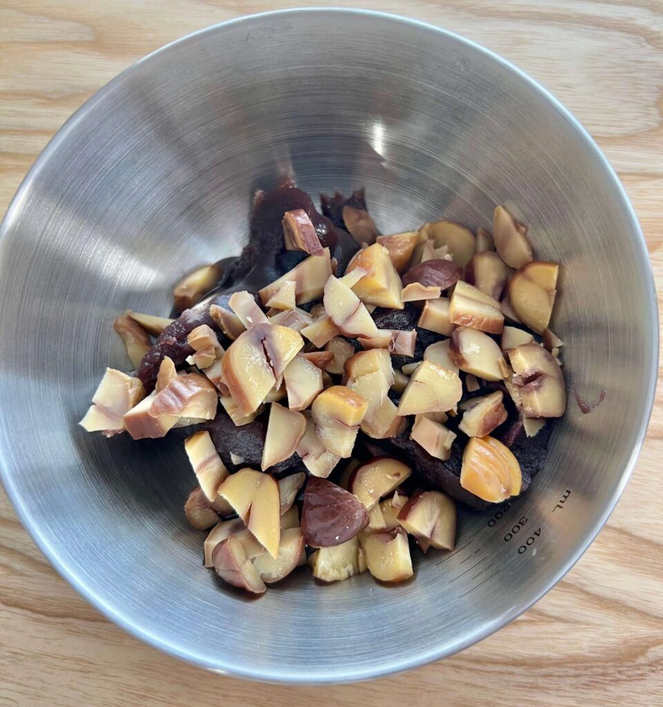 【下準備】甘栗を適当な大きさに刻み、餡に混ぜる。