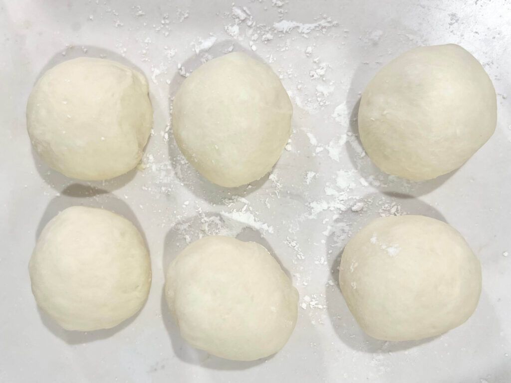 ①生地が完成したら、パンケースから取り出して6分割し、丸める。
