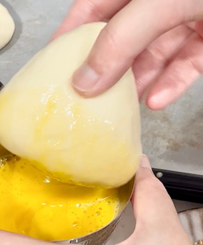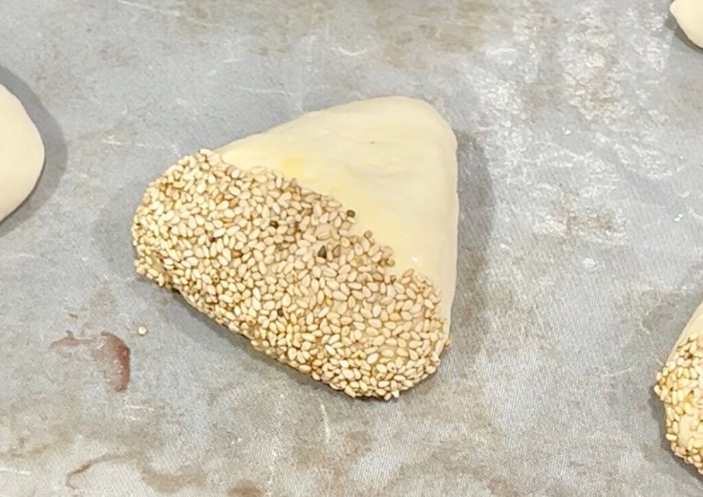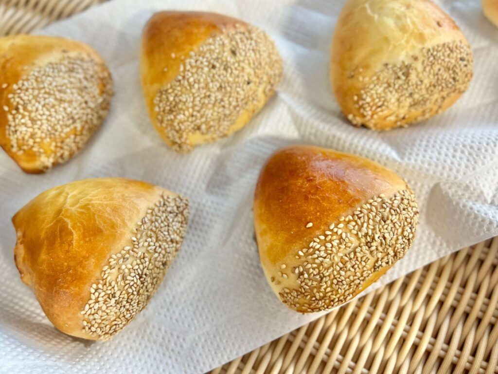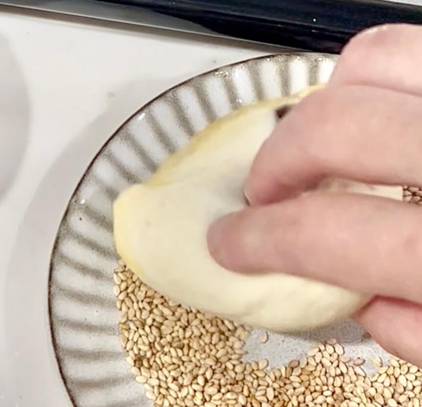 ⑧【焼成】ゴマがついていない部分に卵をハケで塗り、180度に予熱したオーブンで15分焼く。
