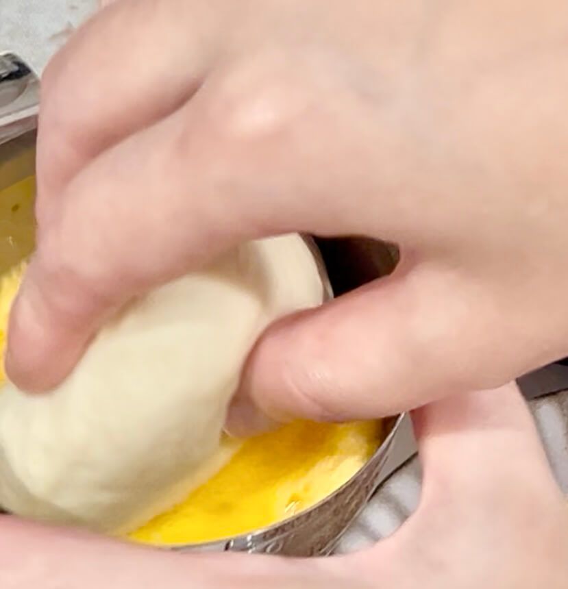 生地や手が餡で汚れているとうまく包めなくなるため、餡は上からポトっと落とすイメージで置き、指は汚れたらすぐ、おてふきで拭き取りましょう。