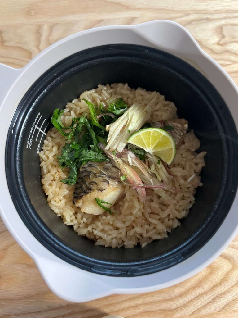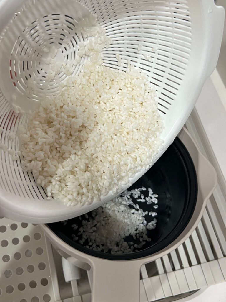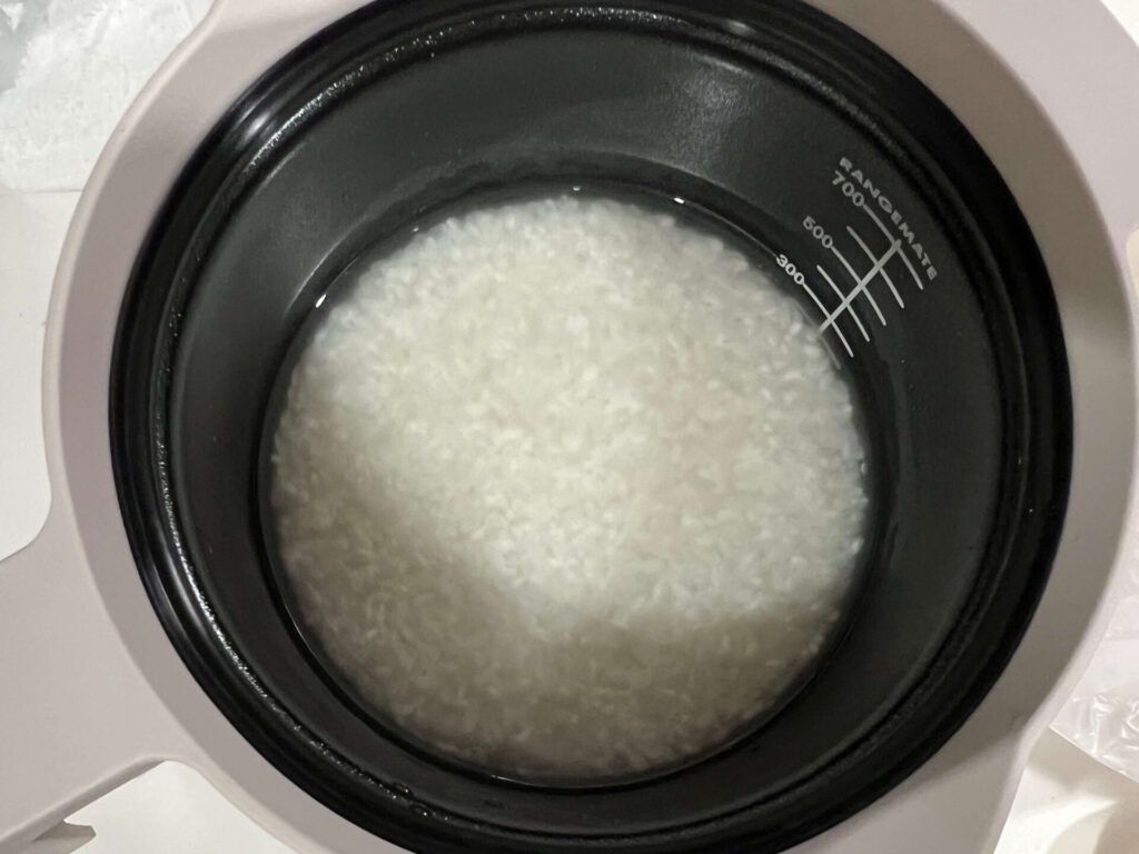 マグポットに①の浸水した米を水を切り入れ、水と和風顆粒だし、②を調味料ごと入れる。